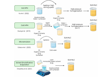 In the production of drug-loaded Nano-Structured Lipid Carriers (NLCs), cold high-pressure mixing and hot high-pressure mixing—commonly referred to as cold HPH and hot HPH—are the most widely used techniques. Hot HPH is defined as the preparation of medications using a blend of melted liquid lipids and solid lipids. The combination of lipids and hydrophobic drugs under elevated temperatures is subsequently homogenized with a high-pressure solvent evaporator, undergoing 3–5 cycles to ensure thorough mixing with a heated water-based solution that includes both hydrophilic surfactants (like Tween) and amphiphilic surfactants (such as lecithin).