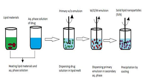 This method is extensively used for hydrophilic drugs, which are water-loving, and also for drugs that are sensitive to temperature. The double emulsion technique is applied to manufacture drug/biomolecule-loaded NLCs (like proteins and peptides)