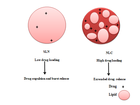 The inclusion of liquid lipids in the NLC matrix enhances drug solubility and significantly decreases the likelihood of drug leakage after preparation and during storage. In comparison to SLNs, NLCs are capable of providing more controlled drug release profiles. Although NLCs remain solid at physiological temperature, they possess lower melting points than SLNs. Their disordered lipid arrangement and crystalline imperfections create additional space for drug incorporation, particularly within the liquid lipid domains, thereby improving drug payload capacity.