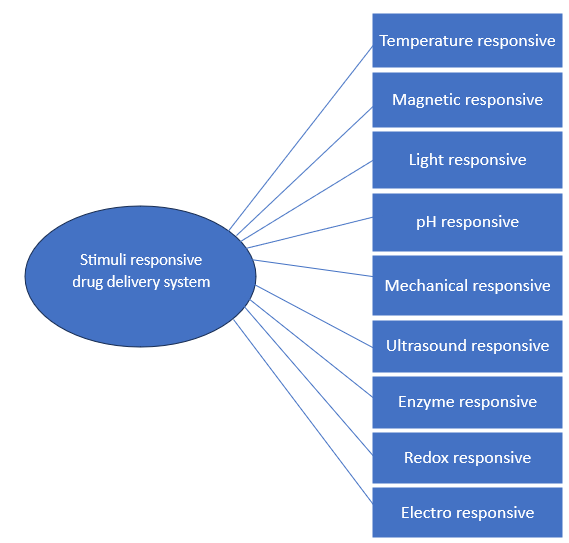 The drug delivery systems which respond to the stimuli are the most advanced systems, helps in diagnosing the diseases and treating them. Different types of stimuli have unique mechanism of drug release, which provides the targeted and controlled release of drug. Different stimuli such as temperature, pH, enzymatic, light, ultrasound, magnetic, mechanical, electrical and redox stimuli help in the drug delivery at the targeted regions in the body. Especially used for cancer chemotherapy. Based on the environment around the diseased state the drug will get release, high temperature around the cancer cell leads to the drug release when the drug is incorporated in the temperature sensitive polymer. In the same way different polymers respond in different ways based on the stimuli. There are many applications of stimuli responsive drug delivery systems such as cancer chemotherapy, in the treatment of inflammatory diseases, arthritis, Alzheimer’s disease and cardiac diseases. Also had wide scope in tissue engineering.