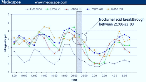 Figure 2. Twenty-four-hour intragastric pH profiles of daily-dosed PPIs show the onset of nocturnal acid breakthrough between 9:00 and 10:00 PM for all PPIs. [7]