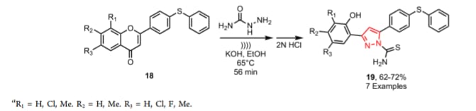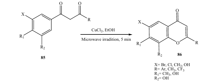 In 2005, Kabalka and Mer eddy (28) reported a facile microwave synthesis of functionalized flavones and chromans via the cyclization of 1(2hydroxyaryl)3aryl1,3propanedione (Scheme). In their study, the intermediate 1,3propanediones 85 were synthesized in 5 min via dehydrative cyclization to the corresponding flavones and chromans 86 in ethanol, in the presence of CuCl2 under microwave irradiation.