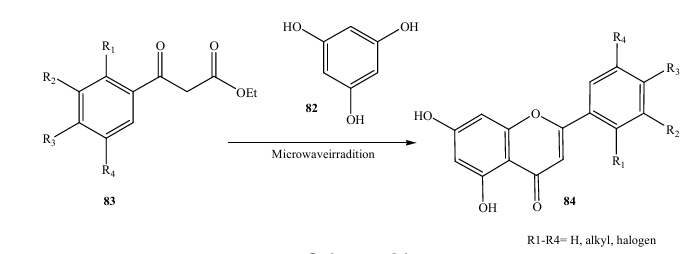 Recently, microwave irradiation 80 offers a considerable advantage over conventional heating because it results in substantial rate enhancements in a wide range of organic reactions. Cleaner reactions are also commonly achieved, together with improvements in yield and selectivity. The increasing demand for clean and ‘‘green’’ chemical syntheses has resulted in increased use of microwave irradiation, so there have been several recent reports, describing the application of microwave irradiation to the synthesis of flavonoids. In 2005, Seijas et al. (27) reported an ecofriendly direct solvent free synthesis of functionalized flavones 84 under microwave irradiation (Scheme). This method was valid for flavones with or without substitution in the B ring. Thus, the flavonoids were prepared from the corresponding ethyl benzoyl acetates 83 and phloroglucinol for 2–12 min of irradiation in 66–96% yields. The successful use of microwave irradiation in providing this rapid and direct route to flavones in comparison to classical procedures contributes to confirming the participation of specific effects in some microwave assisted organic synthesis.