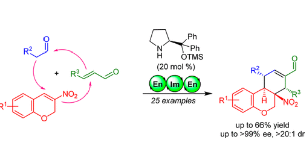 A highly stereoselective triple domino reaction for the synthesis of functionalized tricyclic chroman scaffolds has been developed. A secondary amine-catalyzed domino Michael/Michael/aldol condensation reaction between aliphatic aldehydes, nitro-chromanes, and α, β-unsaturated aldehydes lead to the formation of synthetically important tricyclic chromanes bearing four contiguous stereo genic centers including a tetrasubstituted carbon in good yields (20–66%) and excellent stereoselectivities (>20:1 dr and >99% ee).(25)