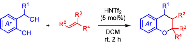 The convergent synthesis of a series of chroman derivatives by a triflimide-catalyzed annulation of o-hydroxy benzylic alcohols with alkenes is reported. The Bronsted acid-catalyzed reaction proceeds from simple starting materials under mild conditions and provides chroman products of varying substitution patterns. (24)