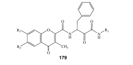 1.Antioxidant: Lee and coworkers (2011), reported that new chromone carboxamide derivatives 179 were synthesized as conformationally constrained structural variants of MDL, to provide alternative calpain inhibitors and antioxidant activities in DPPH scavenging and lipid peroxidation inhibitory effects (38).