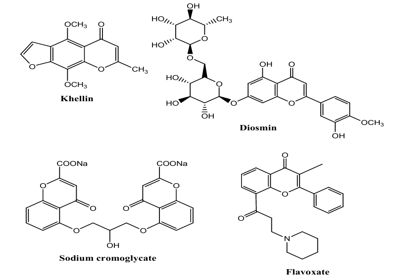 Although there are a large number of chroman derivatives known for their pharmacological properties there are only a few examples that have been or that are used as therapeutic agents today. Khellin as an example extracted from the seeds of the plant Ammi visnaga, was the first chroman in clinical practice and it has been used for centuries in the Mediterranean area as a diuretic to relieve renal colic (16). Around the 1950s, khellin was used as a smooth muscle relaxant in the treatment of angina pectoris and asthma (17). However, present use of khellin as a therapeutic agent focuses on the treatment of vitiligo, a pigmentation disorder (18). Other current medical treatments with chroman derivatives are exemplified by sodium cromoglycate (Lomudal) used as a mast cell stabilizer in allergic rhinitis, asthma and allergic conjunctivitis; diosmin (Daflon) for the treatment of venous diseases; flavoxate as smooth muscle relaxant to treat urge incontinence (19-23).