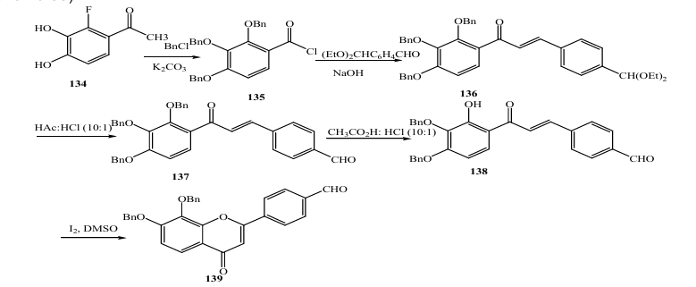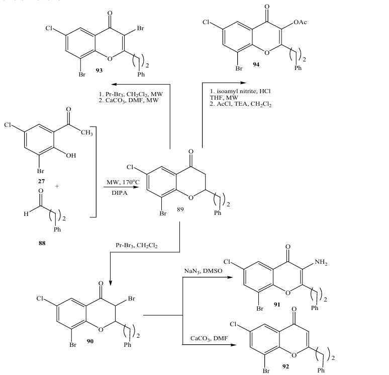 In 2009, Luthman and coworkers (29) reported a base promoted condensation between 2 hydroxy acetophenones 87 and aliphatic aldehydes 88 (Scheme); they optimized the reaction to afford 2alkylsubstituted 4chromanones 89 in an efficient manner using microwave heating. Performing the reaction using diisopropylamino in EtOH at 170 0C for 1 h gave high yield in 88%. The 4chromanones could be further converted into highly functionalized 2,3,6,8tetrasubstituted chromones in which a 3substituent (acetate, amine, or bromine) was introduced via straightforward chemical transformations.