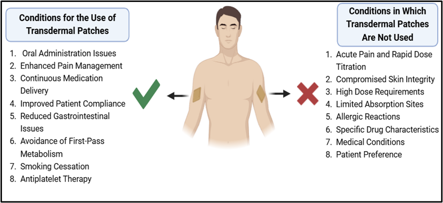 A transdermal drug delivery system (TDDS) is a method of delivering medication through the skin for systemic effects. It typically involves the use of patches that contain a specific dose of the drug, which is absorbed into the bloodstream via the skin. This approach allows for the controlled release of the drug over time, improving patient compliance and minimizing side effects compared to other routes of administration. Transdermal drug delivery systems (TDDS) offer an alternative to oral administration, providing sustained release of therapeutic agents and improving patient compliance.[1] TDDS is especially useful for patients unable to take oral medication, such as those experiencing vomiting or unconsciousness, and bypasses first-pass metabolism, reducing side effects associated with oral drugs.[2] However, TDDS efficacy depends on factors such as skin permeability, which varies among individuals, and the physicochemical properties of the drug.[3] While the market for TDDS is growing, challenges like skin irritation, variability in drug absorption, and optimizing drug delivery rates remain.[4] Adverse Despite progress, there is a gap in understanding how to enhance permeation while reducing adverse reactions. This review aims to explore the present scenario of TDDS, identify its advantages and disadvantages, and propose innovative strategies to optimize drug delivery, ensuring safety and improving clinical outcomes.
