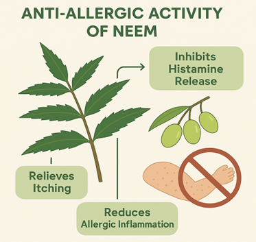Neem helps alleviate itching and allergic skin reactions: Inhibits histamine release and mast cell degranulation.