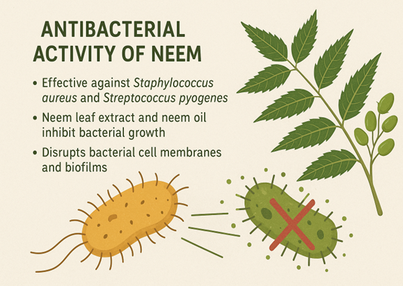 Neem demonstrates strong antibacterial action, effectively targeting numerous pathogens responsible for skin infections." Active against Staphylococcus aureus, Streptococcus pyogenes, and Propionibacterium acnes—major causative agents of acne, boils, and other skin infections. Neem leaf and bark extracts, as well as neem oil, have been shown to inhibit bacterial growth and biofilm formation.