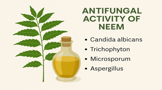 Neem possesses broad-spectrum antifungal properties: Effective against Candida albicans, Trichophyton, Epidermophyton, and Microsporum species. Neem extracts interfere with fungal cell membranes and inhibit fungal proliferation.
