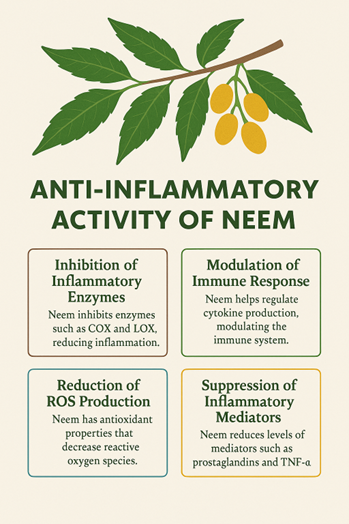 Neem compounds like nimbidin, quercetin, and nimbolide modulate inflammatory pathways: Suppress the production of pro-inflammatory . It suppresses the activity of cyclooxygenase (COX) and lipoxygenase (LOX) enzymes, thereby alleviating inflammation and associated discomfort."