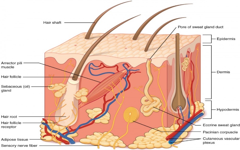 The dermis layer, measuring 1.5-4 mm thick, sits beneath the epidermis. It is made up of collagen elastins, sweat and oil glands, hair follicles, nerve endings, blood, and lymph vessels. The dermis contains immune scavenger cells that absorb and destroy invading organisms. The sensation of touch is caused by nerve endings. The hypodermis, sometimes called subcutaneous tissue, is the deepest layer of skin that works as an insulator and shock absorber, protecting internal organs from harm. It also stores fat. Via these layers, the blood arteries, nerves, lymph vessels, and hair follicles also cross-link. [2].