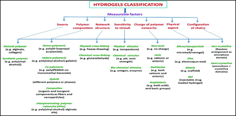 1.2. Introduction of hydrogel: Cross-linked three-dimensional networks made of water-soluble polymers are called hydrogels. Traditionally, hydrogels have been used to transport hydrophilic small molecules. Large amounts of hydrophilic drugs are somewhat easier to load into swelling hydrogel in these networks than hydrophobic drugs. Since a hydrophobic drug and the hydrophilic hydrogel network 1 are incompatible, introducing a hydrophobic medication into a hydrogel-based formulation is difficult in a number of ways. A drug's water solubility can be improved by co-solvency, hydrotropism, complex formation, ionisation, and the addition of surfactants in order to get around the issue. [1] Physical hydrogels have a variety of medicinal Physical gels may deteriorate if natural domain conditions change, such as ionic purity, pH, and temperature. Physical hydrogels have a variety of medicinal applications, including pill delivery, wound dressing, tissue design, and more. Covalently cross-joined hydrogels, often known as "smart" hydrogels, can change volume/shape with minor changes to specific parameters of nature's turf. Responsive hydrogels feature a variety of provisions, the bulk of which revolve around organic and therapeutic demands, as well as sensing requisitions. Single-system hydrogels have weak mechanical characteristics and a modest swelling reaction [22]. Various methods from material science, microscale design, and microfluidics have been used to synthesise biomimetic hydrogels. applications, including pill delivery, wound dressing, tissue design, and more. Covalently cross-joined hydrogels, often known as "smart" hydrogels, can change volume/shape with minor changes to specific parameters of nature's turf. Responsive hydrogels feature a variety of provisions, the bulk of which revolve around organic and therapeutic demands, as well as sensing requisitions. Single-system hydrogels have weak mechanical characteristics and a modest swelling reaction. Various methods from material science, microscale design, and microfluidics have been used to of synthesise biomimetic hydrogels. [8]