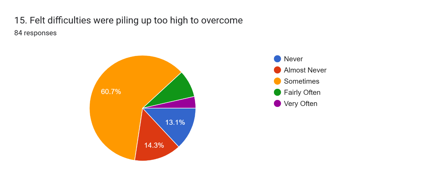 15. Most respondents sometimes felt that difficulties were piling up too high to overcome, indicating intermittent overload rather than persistent helplessness, with only a small proportion experiencing this frequently. This reflects moderate perceived stress overall. Consistent with Cohen, Kamarck, and Mermelstein (1983), these findings show that feelings of being overwhelmed are a core aspect of perceived stress but are usually experienced occasionally rather than chronically in general populations.