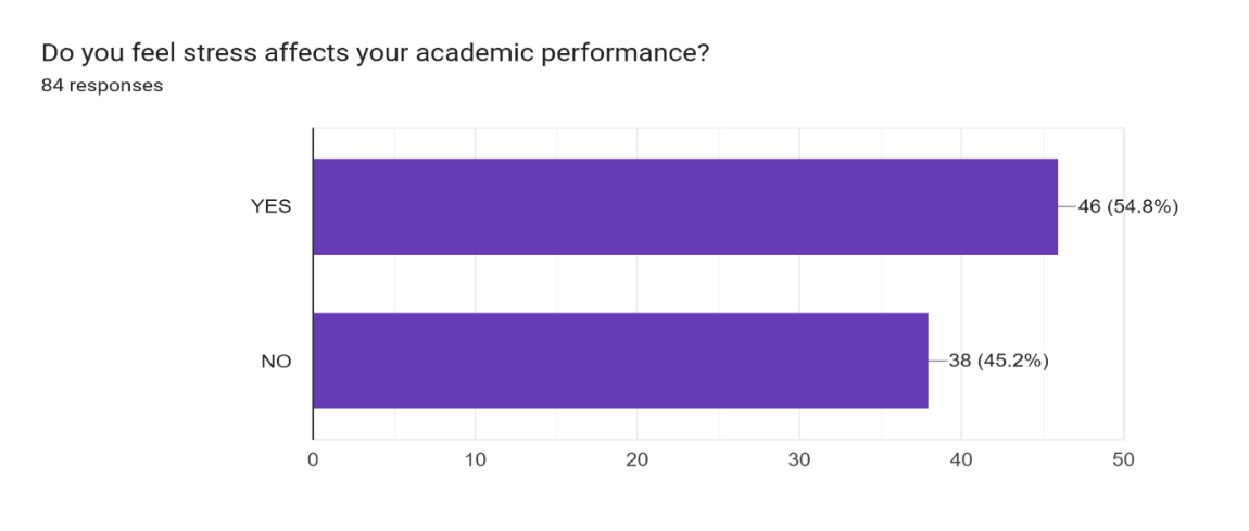 34. Over half of respondents (54.8%) felt that stress negatively affected their academic performance, while others did not, reflecting varied student experiences. This aligns with Academic Stress and Its Impact on Academic Performance, which found that stress significantly distracts students and reduces academic achievement. Together, these findings highlight the importance of strengthening stress-management support to protect learning outcomes and student success.