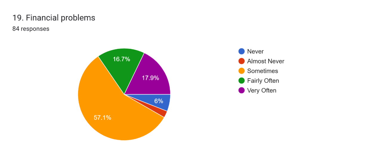 19.The survey shows that most students (57.1%) sometimes face financial problems, with notable proportions experiencing them fairly or very often, indicating that financial stress is a common concern. This aligns with Richardson, Elliott, and Roberts (2017), who found that financial difficulties are significantly associated with higher stress, poorer academic performance, and reduced well-being. Together, these findings highlight financial strain as an important factor influencing student engagement and overall success.