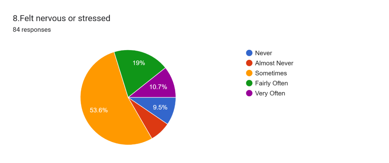 8.The survey found that most respondents experienced nervousness or stress at least occasionally, with many reporting frequent stress, consistent with findings from studies using the Perceived Stress Scale (PSS). Similarly, Perceived stress, sources of stress and coping strategies among medical students reported that a majority of students scored above the stress cut off and felt stressed during their course. Together, these results highlight stress as a common subjective experience linked to everyday academic demands and overall well-being.