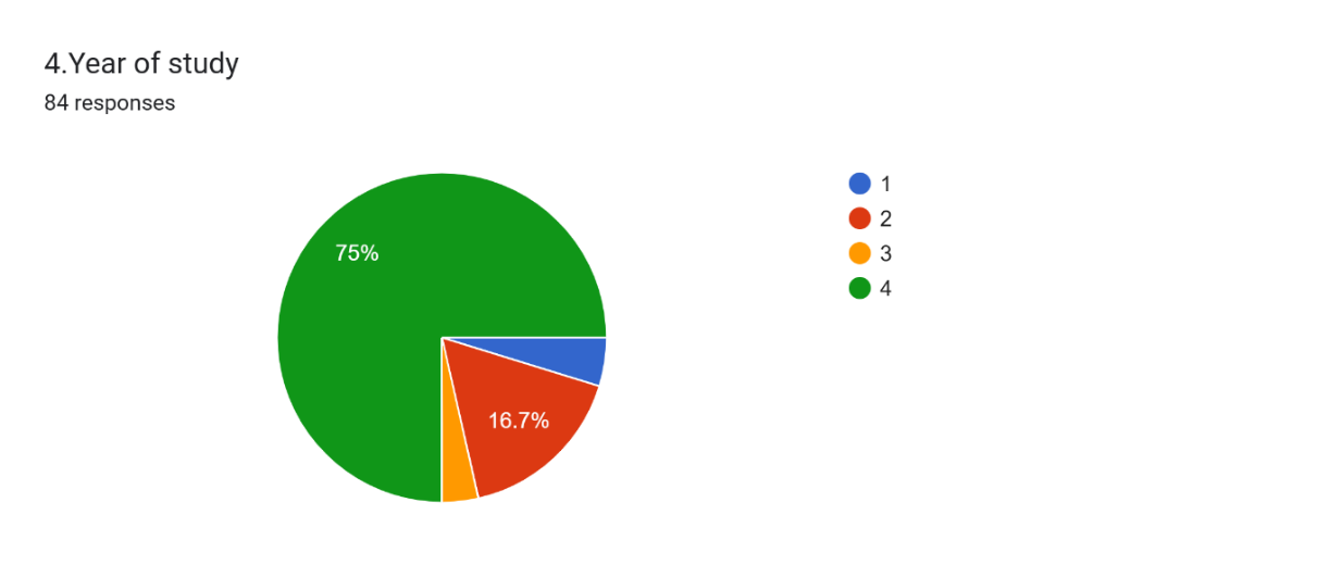4.The majority of participants were final-year students (75%), followed by second-year students (16.7%), indicating higher participation from students nearing course completion. Similar observations were reported by Beiter et al. (2019) and Aristovnik et al. (2020), where final-year students experienced increased stress due to academic workload and career-related concerns