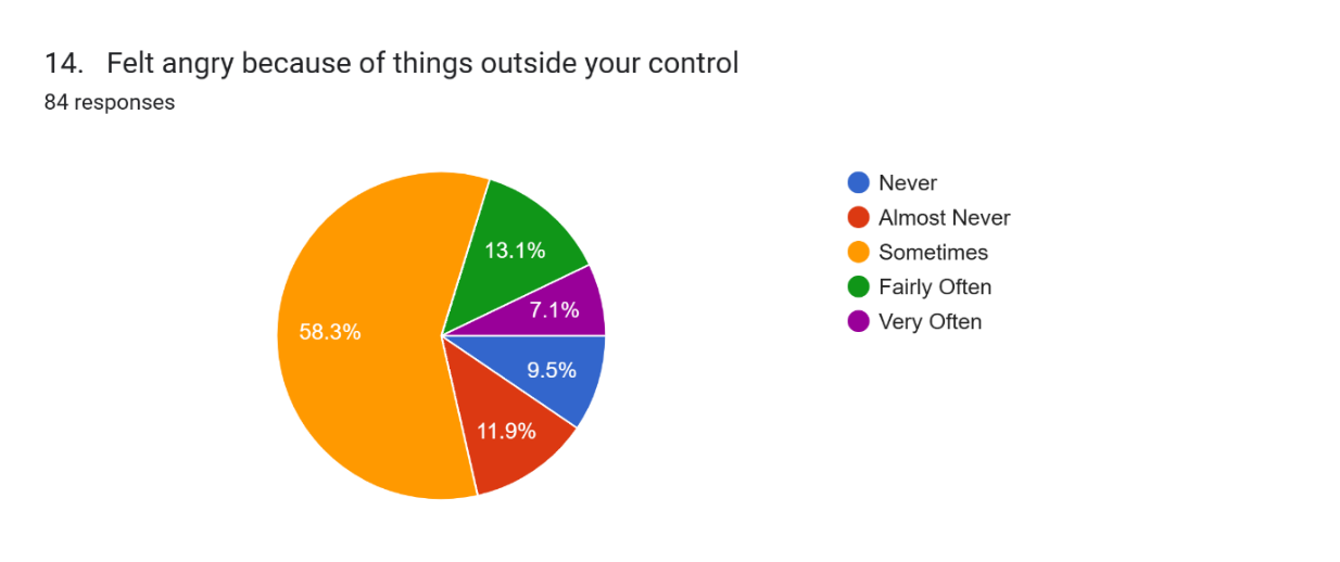 14. Most respondents sometimes felt angry due to circumstances beyond their control, indicating situational emotional responses, while only a small proportion experienced this frequently. This suggests moderate emotional reactivity rather than chronic anger. Consistent with Cohen, Kamarck, and Mermelstein (1983), these findings show that anger and frustration linked to lack of control are common but typically experienced occasionally in general populations.