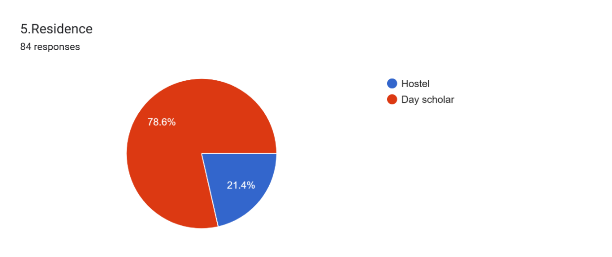 5.The majority of participants were day scholars (78.6%), while hostel residents constituted 21.4% of the study population. Similar findings were reported by Beiter et al. (2019) and Aristovnik et al. (2020), where day scholars reported higher stress due to commuting, family expectations, and time management issues.