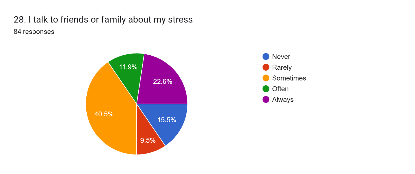 28.The survey indicates that most respondents sometimes talk to friends or family about their stress, with many reporting they always do, highlighting social support as a common coping strategy. This aligns with Social Support and Stress among College Students, which found that sharing concerns with close networks is linked to lower anxiety and better coping. Together, these findings emphasize the value of open communication in reducing psychological distress and improving stress management