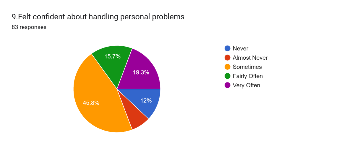 9.Nearly half of respondents reported feeling confident sometimes in handling personal problems, while many felt confident fairly or very often, indicating moderate self-efficacy overall. This aligns with findings from Perceived problem solving, stress, and health among college students, which showed that greater perceived problem-solving ability is significantly associated with lower stress and better health outcomes. Together, these results suggest that confidence in managing personal problems plays an important role in effective stress coping and overall well-being.