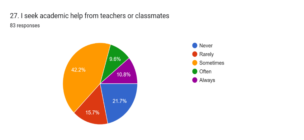 27.The survey shows that many respondents sometimes seek academic help, while fewer do so regularly or not at all, indicating varied help-seeking behaviors. This aligns with The Role of Help-Seeking in Students’ Academic Success, which found that students who actively seek support tend to achieve better academic outcomes and experience lower stress. Together, these findings highlight the importance of fostering supportive learning environments to encourage help-seeking and improve student well-being.