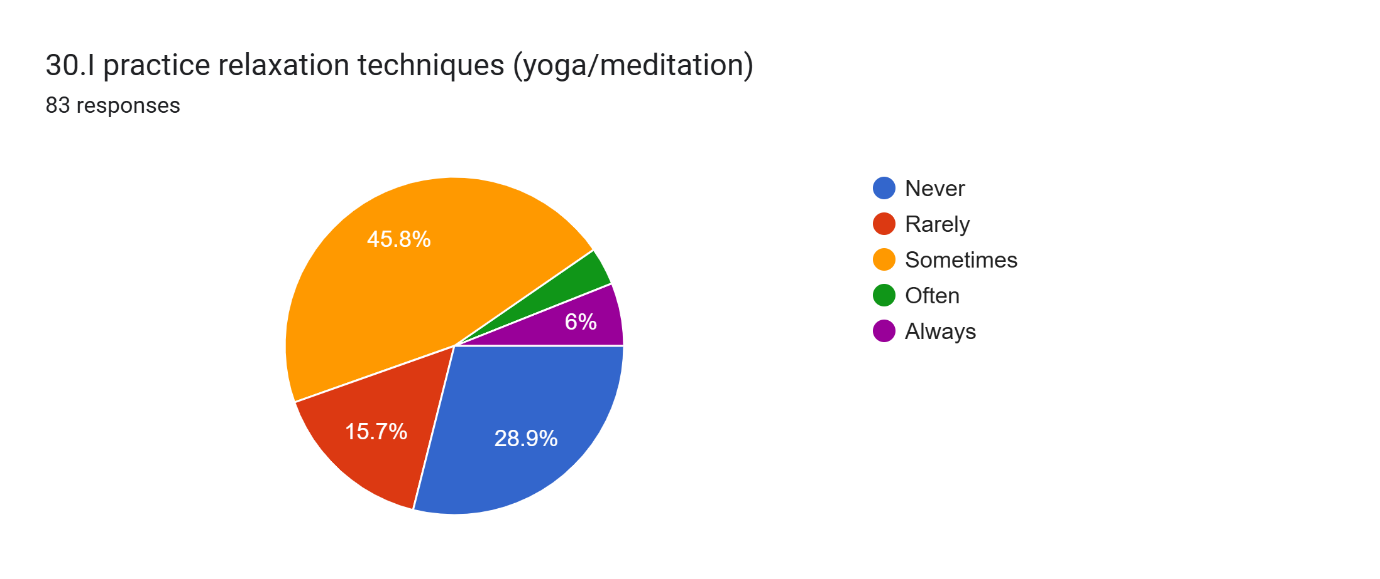 30.Nearly half of respondents sometimes practice relaxation techniques such as yoga or meditation, while many rarely or never do, indicating uneven adoption of formal stress-reduction practices. This aligns with Mindfulness, Yoga, and Stress Reduction in College Students: A Meta-Analysis, which found that regular engagement in these practices is associated with lower stress and better psychological health. Together, these findings highlight the need to promote mindfulness and relaxation strategies to improve overall well-being.