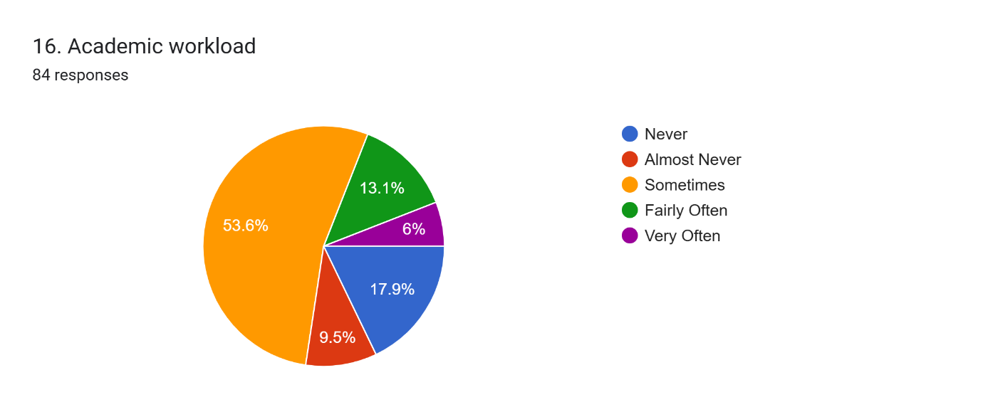 16. The survey shows that most students (53.6%) sometimes experience academic workload, with smaller groups reporting it fairly or very often, indicating moderate but varied perceptions of academic pressure. This aligns with Rubio-Valdehita et al. (2014), who found that higher perceived workload is linked to increased stress, while supportive academic environments help reduce overload. Together, these findings highlight the importance of managing academic demands to promote student well-being and performance.