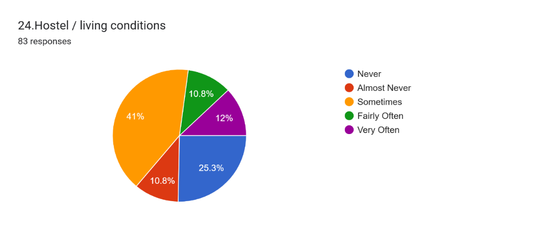24.The survey indicates that many respondents sometimes experience hostel or living-condition issues, with some reporting regular difficulties, reflecting varied accommodation experiences. This aligns with the study Negative Impact of Living Conditions in a Hostel on Students, which found that poor hostel environments negatively affect psychological well-being, stress, and academic performance. Together, these findings emphasize the importance of improving living conditions and support systems to enhance student well-being and adjustment.