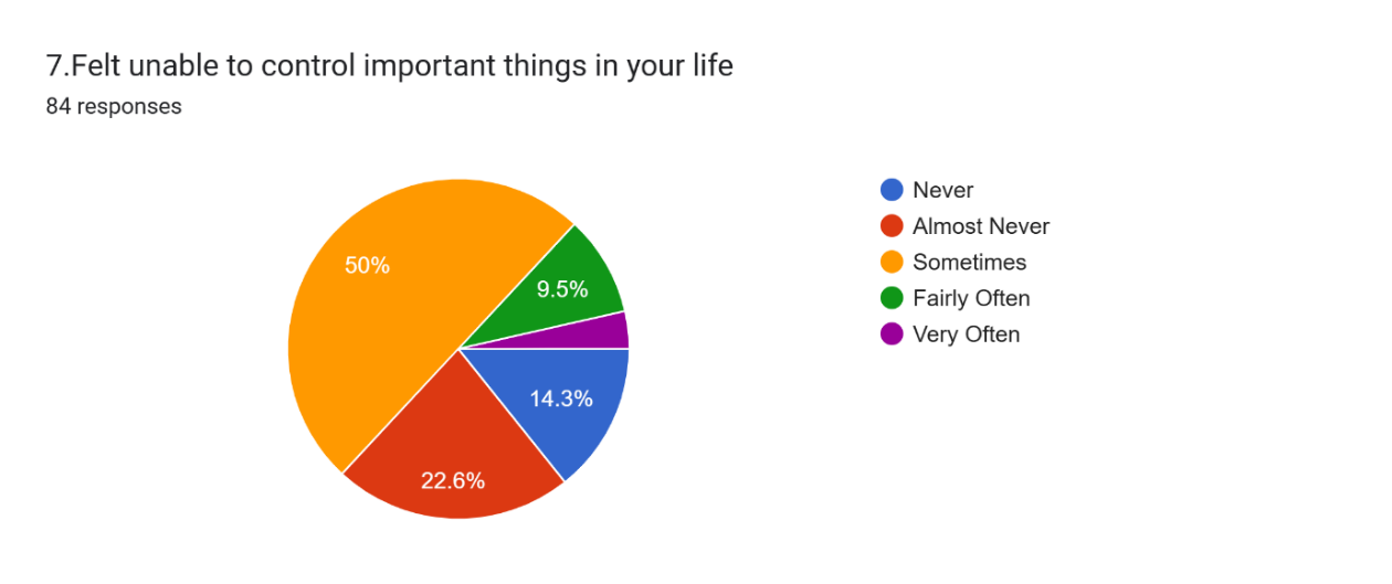 7.Half of the students reported feeling unable to control important aspects of their life sometimes (50%), indicating a moderate level of perceived stress. Similar findings were reported by Son et al. (2020) and Aristovnik et al. (2020), where students frequently experienced feelings of loss of control during academic demands and uncertainty.