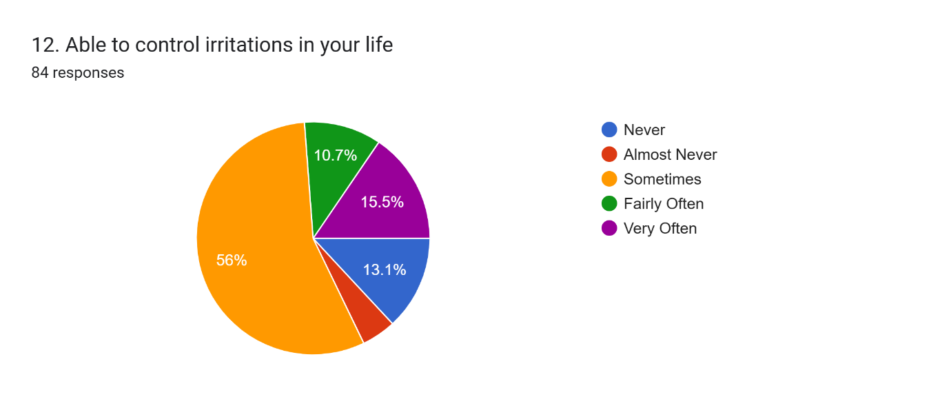 12.Most respondents reported being able to control daily irritations at least sometimes, with many indicating fairly or very often, reflecting generally reasonable emotional regulation, though a small group showed low control. This suggests intermittent difficulty rather than persistent problems in managing stressors. Consistent with Cohen, Kamarck, and Mermelstein (1983), these findings highlight emotional regulation as a key aspect of perceived stress, commonly challenged occasionally in everyday life.