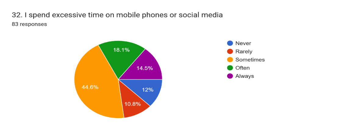 32.The survey shows that many respondents sometimes spend excessive time on mobile phones or social media, with some doing so often or always, indicating that digital engagement is a common behavior. This aligns with Social Media Use and Perceived Stress: A Systematic Review, which found higher social media use associated with increased stress and anxiety among young adults. Together, these findings highlight the need to promote healthy digital habits and time-management strategies to support well-being