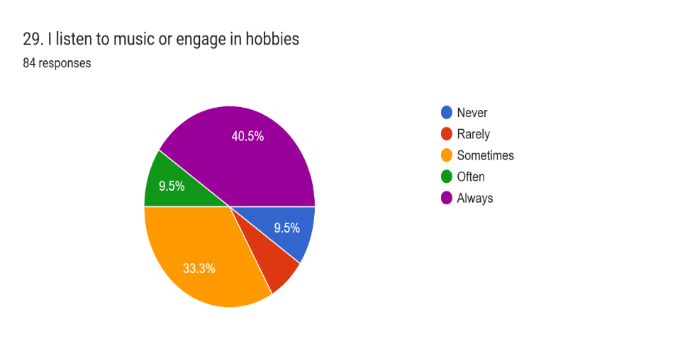 29. Many respondents reported always engaging in music or hobbies, with others doing so sometimes or often, indicating that leisure activities are a common coping strategy for stress. This aligns with The Effect of Music and Leisure Activities on Stress and Mental Health, which found that regular participation in such activities is associated with lower stress and better overall well-being. Together, these findings highlight the role of music and hobbies in supporting emotional health and resilience.