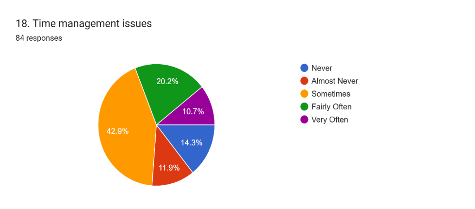18. The survey shows that many students sometimes (42.9%) struggle with time management, with notable proportions experiencing difficulties fairly or very often, indicating variability in organizational skills. This aligns with Britton and Tesser (1991), who found that effective time management is strongly associated with better academic performance and lower stress. Together, these findings highlight time management as a common student challenge and emphasize the need for targeted skill-building support.