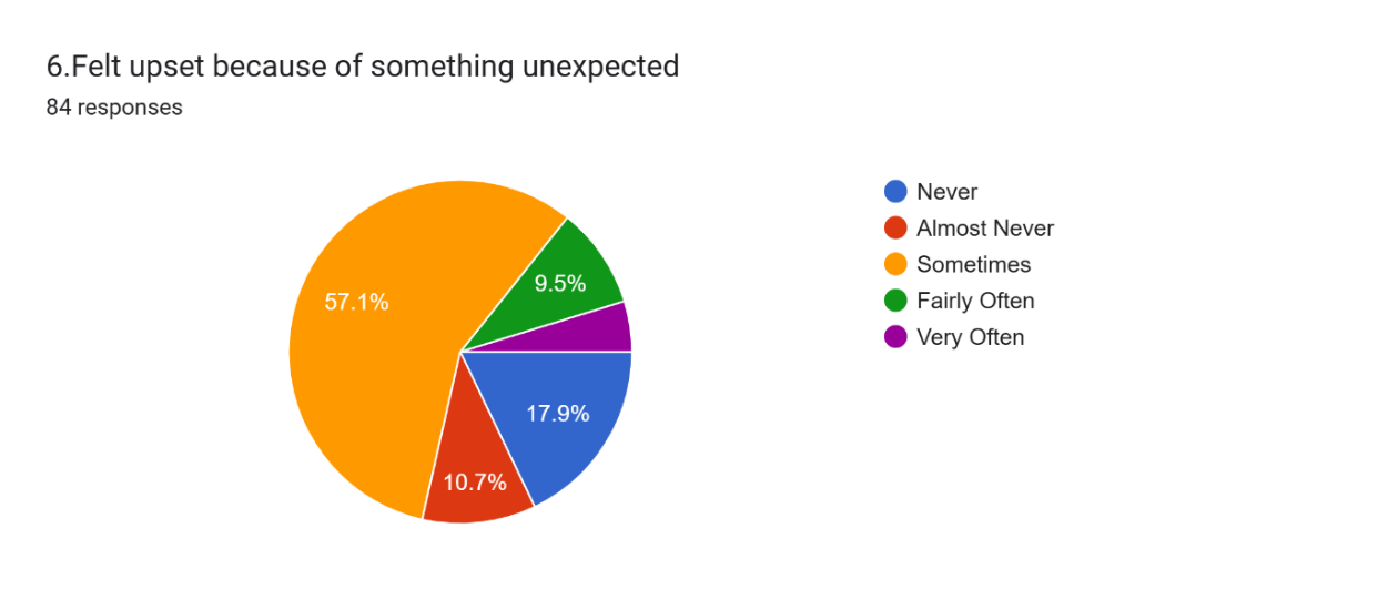 6.More than half of the students reported feeling upset sometimes (57.1%), while a smaller proportion experienced it fairly often or very often, indicating moderate perceived stress due to unexpected events. Similar patterns were observed by Cohen & Williamson (2019) and Son et al. (2020), where students frequently reported occasional distress related to unpredictability in academic and personal life.