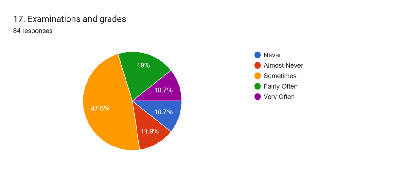 17.Nearly half of students (47.6%) sometimes felt pressure from examinations and grades, with smaller groups experiencing it fairly or very often, indicating varied levels of exam-related stress. This aligns with Putwain (2007), who found that higher test anxiety is linked to increased worry and poorer academic performance. Together, these findings highlight examinations as a common stressor that can influence both student well-being and outcomes.