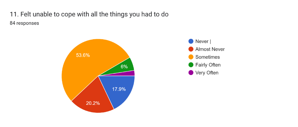 11.More than half of respondents sometimes felt unable to cope with all responsibilities, indicating moderate perceived overload, while only a small proportion experienced this frequently. This suggests occasional strain rather than persistent coping difficulties. Consistent with Cohen, Kamarck, and Mermelstein (1983), these findings show that feelings of being overwhelmed are common but typically experienced intermittently in general populations.