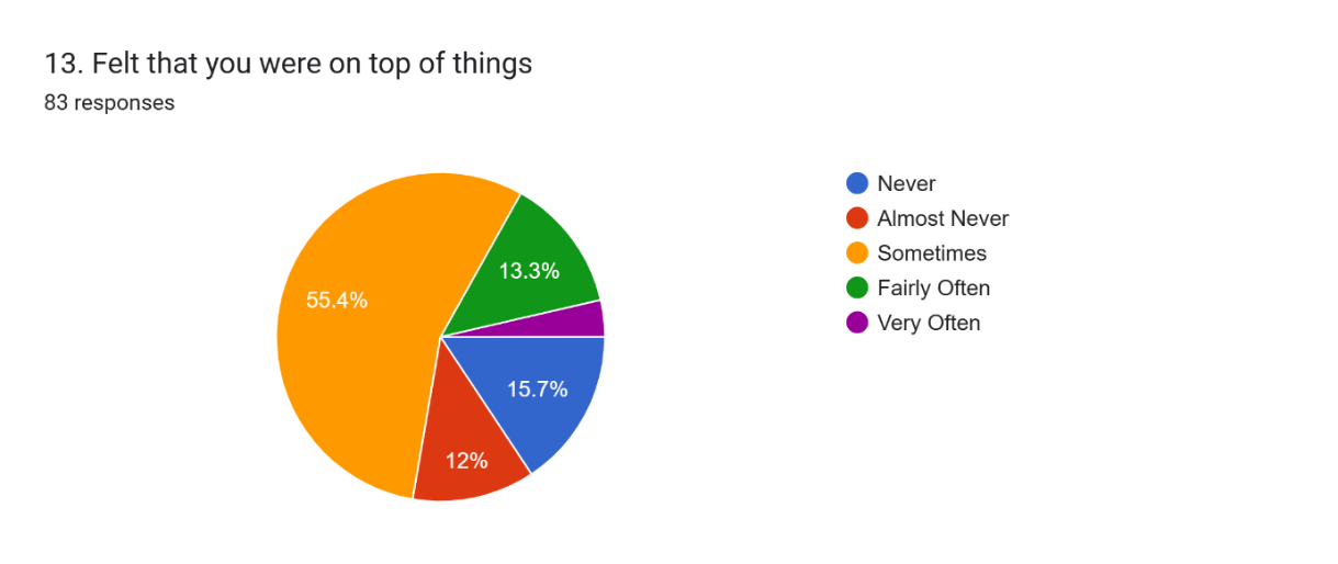 13. Over half of respondents sometimes felt on top of things, indicating moderate perceived control, though fewer experienced this frequently and some rarely did, reflecting variability in daily functioning. Overall, this suggests fluctuating but generally moderate effectiveness in managing life demands. Consistent with Cohen, Kamarck, and Mermelstein (1983), these findings show that feeling in control is inversely related to perceived stress and is commonly experienced intermittently rather than consistently.