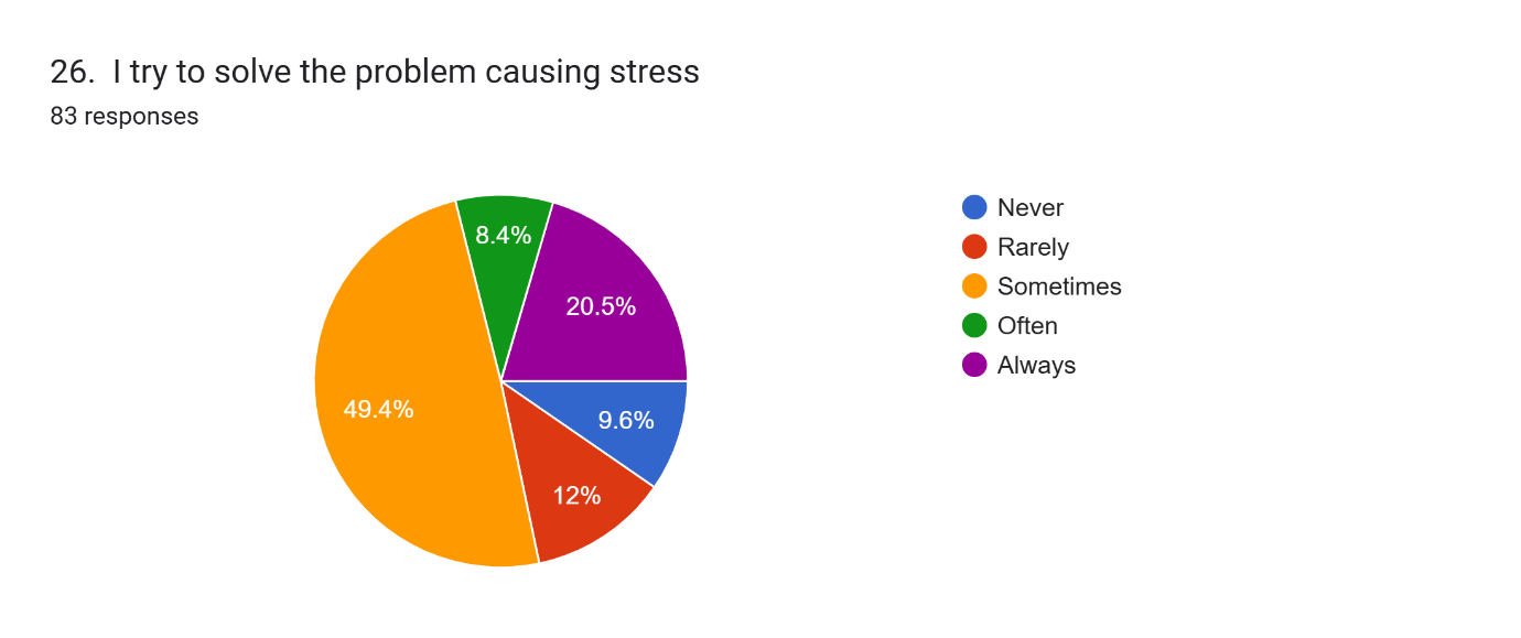 26.Nearly half of respondents sometimes try to actively solve the problems causing their stress, while fewer do so often or always, indicating inconsistent use of problem-focused coping. This aligns with Problem-Focused Coping and Perceived Stress Among College Students, which found that regular problem-solving is associated with lower stress and better academic adjustment. Together, these findings suggest that strengthening problem-solving skills may help improve coping and overall well-being.