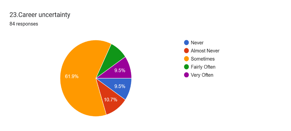 23. The survey shows that most respondents sometimes experience career uncertainty, with fewer reporting strong confidence, indicating that uncertainty about future careers is widespread. This aligns with the 2023 study on Ghanaian students, which found that career uncertainty is driven by anxiety, lack of information, inadequate counselling, and social pressures. Together, these findings highlight the need for better career guidance, self-awareness, and access to information to improve students’ career confidence.