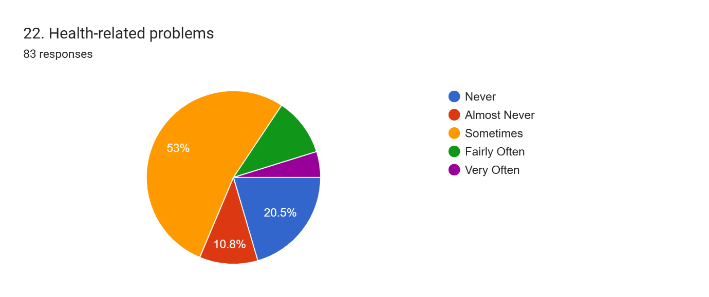 22. The survey indicates that most students (53%) sometimes experience health-related problems, with smaller groups reporting them fairly or very often, while about one-fifth report none, reflecting varied health experiences. This aligns with Stallman (2010), who found high levels of physical and psychological health problems among university students linked to stress and academic performance. Together, these findings suggest that health concerns are moderately common and can affect students’ well-being and academic engagement
