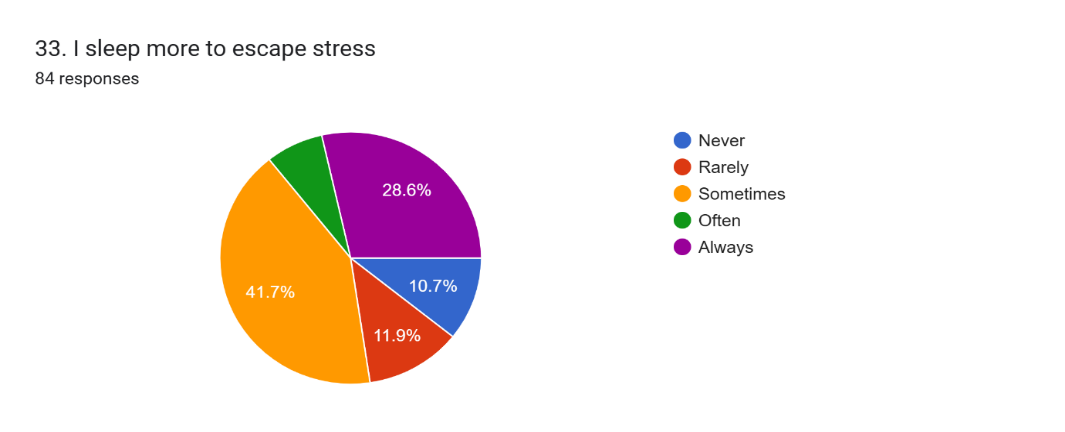 33. Many respondents reported sometimes or always sleeping more to escape stress, indicating that increased sleep is a common coping response. This aligns with Stress and Sleep: A Review of the Literature, which shows that elevated stress is linked to changes in sleep patterns, including increased sleep or disturbances. Together, these findings highlight the close relationship between stress and sleep and emphasize the need for healthier coping strategies to support psychological and sleep well-being.