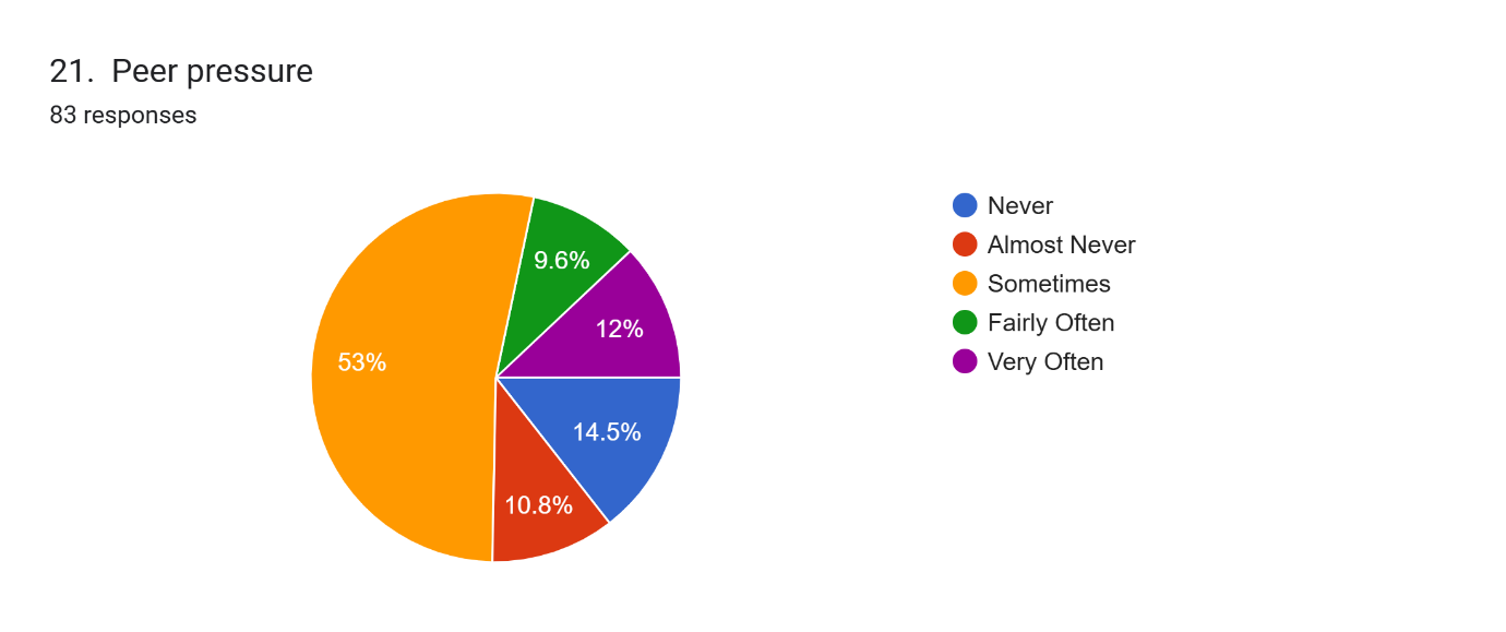 21. The survey shows that most students (53%) sometimes experience peer pressure, with smaller groups feeling it fairly or very often, indicating that peer influence is common but varies in intensity. This aligns with Brown et al. (2008), who reported that higher perceived peer pressure is associated with increased stress and changes in academic and social behavior. Together, these findings highlight peer pressure as an important factor shaping students’ school experiences.