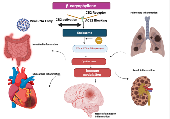 Chronic inflammation is an underlying pathological process of a multitude of diseases and both β-caryophyllene and piperine demonstrate pronounced anti-inflammatory and immunomodulatory effects by unique but possibly overlapping mechanisms, namely via the cannabinoid receptor type 2 (CB2) [60]. β-caryophyllene is an activator of CB2 which provokes a signaling cascade that suppressed the Nuclear Factor-kappa B (NF-kβ) pathway, one of the primary regulators of inflammation, potently. The result of this inhibition is the downstream inhibition of pro-inflammatory cytokines and mediators, such as Tumor Necrosis Factor-alpha (TNF-a), Interleukin-6 (IL-6), and Cyclooxygenase-2 (COX-2) which is an enzyme that produces prostaglandins.