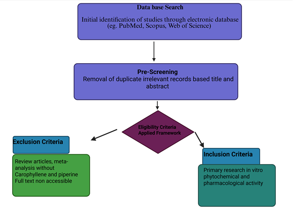 Thus, the purpose, as well as the scope of this systematic review, is to systematically collect, critically evaluate, and synthesize the available scientific data on the phytochemical investigation, biological activities, and the interactive impact of β-caryophyllene and piperine. The scope includes preclinical in vitro and in vivo studies that describe their extraction, characterization, individual pharmacological actions and most importantly, a research describing their interaction [19]. The review will outline the molecular processes involved in their action, review the findings of synergistic interaction, and analyze the toxicological profile of the combination. The review is organized according to important research questions and hypotheses in order to direct this investigation [20-22].