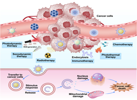 Photodynamic Therapy (PDT): Involves photosensitizers that absorb light (often near-infrared) to produce cytotoxic ROS. Nanomaterials like porphyrin derivatives, Ce6, and indocyanine green (ICG) are commonly loaded into nanocarriers to improve their efficiency.