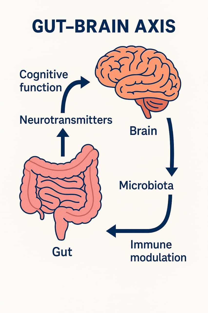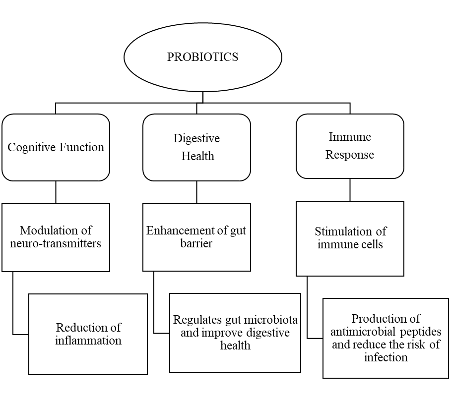 As individuals age, there is a natural decline in central nervous system function, often resulting in cognitive deterioration and mood-related issues.[23] This growing risk of neurological disorders in older adults has led to increased focus on preventive and therapeutic strategies aimed at supporting healthy brain aging. [22,23] One key player in this area is the gut microbiota a diverse community of beneficial microorganisms that significantly influence various physiological processes, including immune regulation and brain function. In recent years, mounting evidence has highlighted the gut-brain axis (Figure 1), a complex bidirectional communication network that connects the gastrointestinal tract with the central nervous system through neural, hormonal, and immune pathways.[23] Probiotics live microorganisms with health-promoting properties have shown promising effects on cognitive health, particularly in older adults. Their beneficial impact on cognition is primarily attributed to their role in modulating the gut-brain axis. Several mechanisms (Figure 2) explain how probiotics may support brain function: